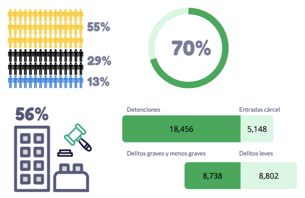 Cuando le pregunto por los cambios judiciales a los que se refiere me especifica que se trata de la AB 109, una medida votada en 2011 que redirige a los acusados condenados por delitos graves y menos graves para que cumplan su condena en la cárcel del condado local en lugar de en una prisión estatal. También cita la Proposición 47 (Prop 47), una medida votada en 2014 que convirtió algunos delitos no violentos contra la propiedad cuyo valor no excede los $950 así como algunos delitos como el de posesión de droga, a la categoría de delitos menores o faltas. En 2022, de las más de doce mil detenciones que conllevaron ingreso a prisión en el Condado de Los Ángeles, el 95% fue por delitos graves y menos graves, la mayoría (cerca de siete mil) fueron por delitos contra las personas (lesiones).