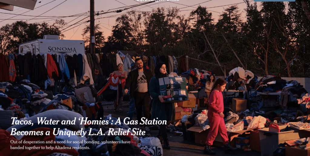 En Los Ángeles, tras los incendios, la sobrecarga de donaciones físicas (ropa, muebles, etc.) obligó a los mismos ciudadanos a organizarse. Centros de acopio improvisados como gasolineras y gimnasios han abundado, así como psicólogos ofreciendo sus servicios gratuitamente o granjas que acogían animales.
